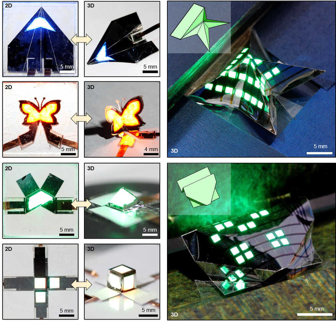 이번 연구에서는 더 나아가 종이접기를 하듯 초박형 QLED를 원하는 형태로 자유자재로 접을 수 있게 만들었다. 이를 바탕으로 나비, 비행기, 피라미드 등 복잡한 구조를 가진 3차원 폴더블 QLED를 제작하는데 성공했다.