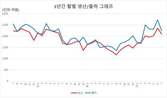 생산은 2097억 원으로 전월 대비 11.1% 감소했고 전년 동월 대비로는 58.5% 증가했다. 출하는 2246억 원으로 전월 대비 17.8% 감소했으나 전년 동월 대비로는 48.0% 증가했다.