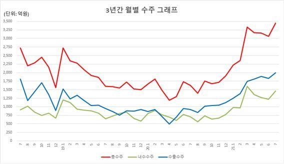 수출은 1억 9200만 달러로 전월 대비 3.4% 감소했으나 전년 동월 대비로는 34.6% 증가했다.