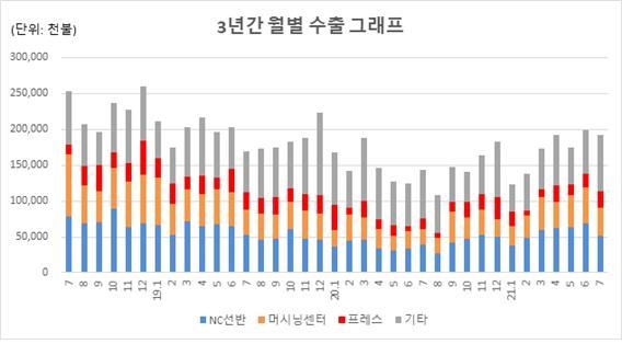 올해 1∼7월 공작기계 생산은 1조 3862억 원 전년 동기 보다 24.5% 늘었고, 출하는 1조 5529억 원으로 전년 동기 보다 36.9% 늘었다.