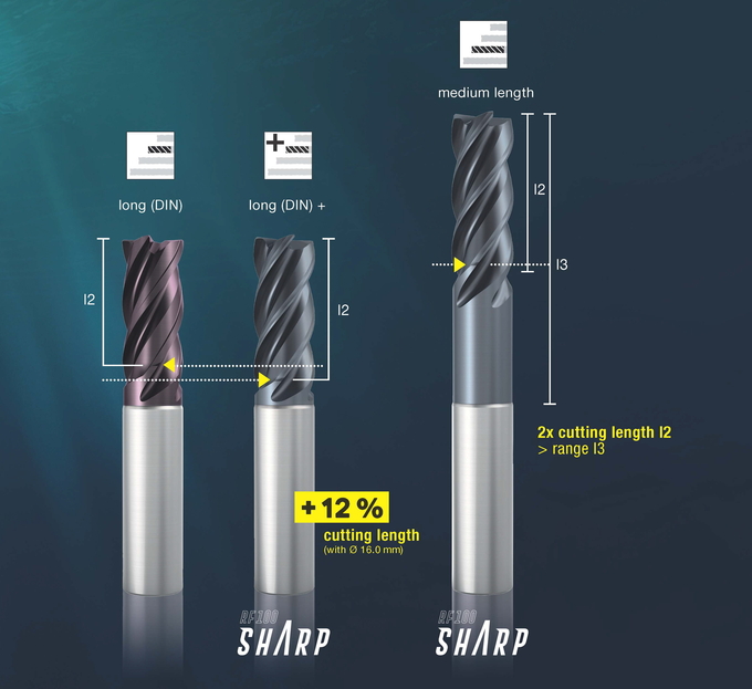 RF 100 SHARP 엔드밀은 마이크로 가공이 가능한 직경 1mm부터 20mm까지 공급되며, 기본적으로 DIN 규격이나 일반 규격보다 날장이 긴 버전이 추가로 공급된다. 기존 엔드밀과 비교해 날장은 D16 기준 12% 크다. 이로 인해 가공깊이가 깊을 때도 공구직경이 더 작은 공구를 사용할 수 있고 적은 종류의 엔드밀로 다양한 가공이 가능하며, 공구 재연마 횟수를 늘릴 수 있는 만큼 경제적이다.