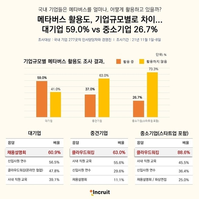 취업포털 인크루트(대표 서미영)는 ‘기업의 메타버스 활용사례’를 알아보기 위해 국내 기업 277곳(대기업 39곳, 중견기업 73곳, 스타트업 포함 중소기업 165곳)의 인사담당자와 경영진을 대상으로 설문조사를 했다.