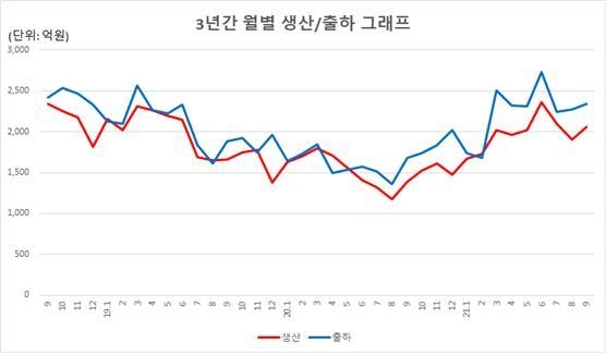생산은 2060억 원으로 전월 대비 8.0% 증가했고 전년 동월 대비로는 48.3% 했다. 출하는 2341억 원으로 전월 대비 3.1% 증가했고 전년 동월 대비로는 39.3% 증가했다.