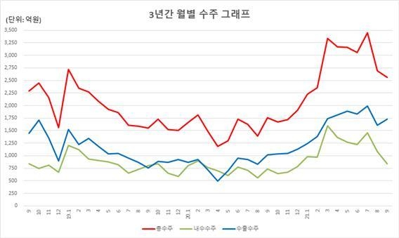 업종별로는 자동차 업종의 올해 9월 수주가 248억 원으로 전월 대비 36.1% 감소했고 전년 동월 대비로도 14.2% 감소했다. 자동차 업종을 제외한 전기·전자·IT(167억 원, -31.5%), 조선·항공(23억 원, -65.4%), 정밀기계(22억 원, -39.7%)은 전월 대비 감소한 반면, 일반기계(154억 원, +11.5%), 철강·비철금속(89억 원, +6.9%), 금속제품(30억 원, +85.8%)은 증가했다.