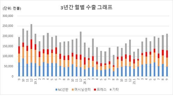 올해 1∼9월 공작기계 생산은 1조 7830억 원으로 전년 동기 대비 30.2% 늘었고 출하는 2조 141억 원으로 전년 동기 보다 40.0% 늘었다.