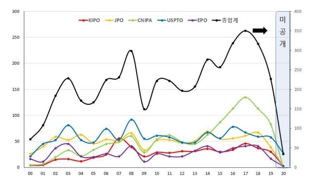 국적별로 살펴보면, 일본이 1974건(44.3%)으로 가장 많고, 한국은 549건(12.3%)으로 네 번째였으며, 특히 중국(617건, 13.8%)은 2014년부터 출원량이 급증해 한국을 앞질렀다.