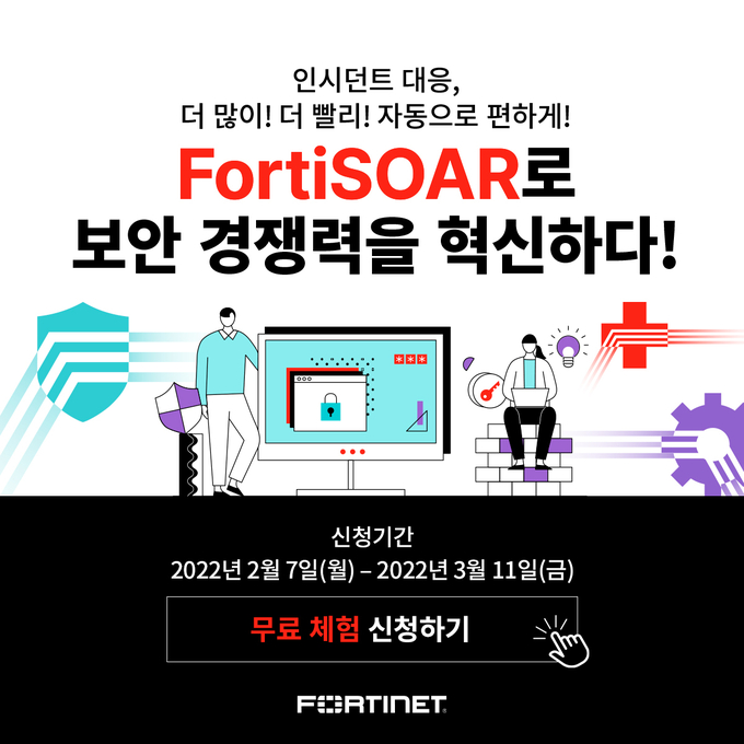 [더테크 뉴스] 포티넷코리아가 고객 대상으로 ‘FortiSOAR 체험 프로모션’을 실시한다고 밝혔다. 프로모션에 대한 신청 접수는 2월 7일부터 3월 11일까지 약 한달 간 진행될 예정이다.