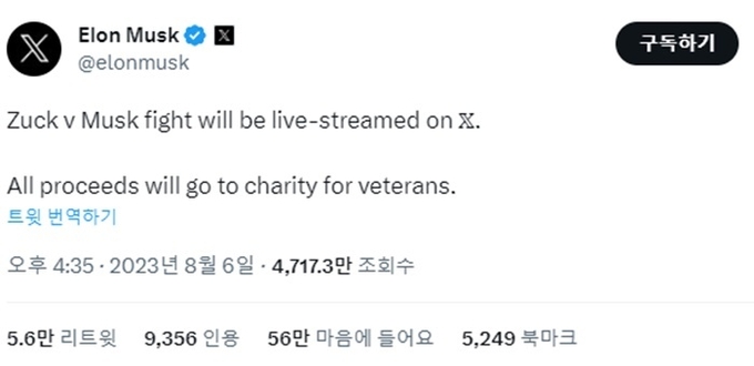 저커버그도 물러서지 않았다. 그는 머스크의 게시물을 자신의 스레드(Threads) 계정에 퍼온 후 “나는 오늘도 준비돼 있다. 머스크가 처음 도발해왔을 때 나는 8월 26일을 (경기날짜로) 제안했는데 그가 답을 안줬다”고 밝혔다.