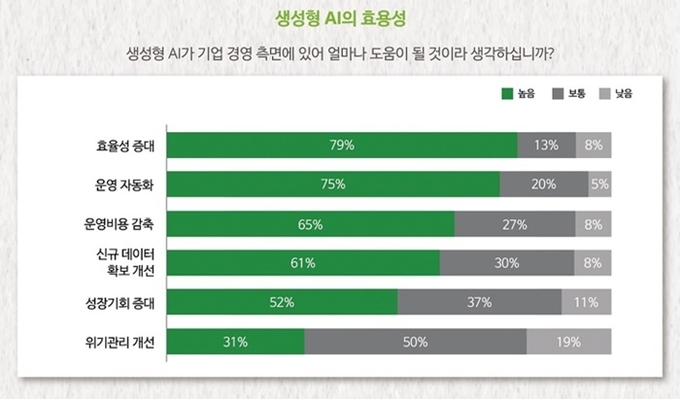 리포트에 따르면 서베이에 응한 CEO 중 79%는 기업경영의 효율성 증대에 생성형 AI가 도움이 될 것이라고 예상했다. ‘운영 자동화’를 꼽은 응답자도 75%나 됐다.