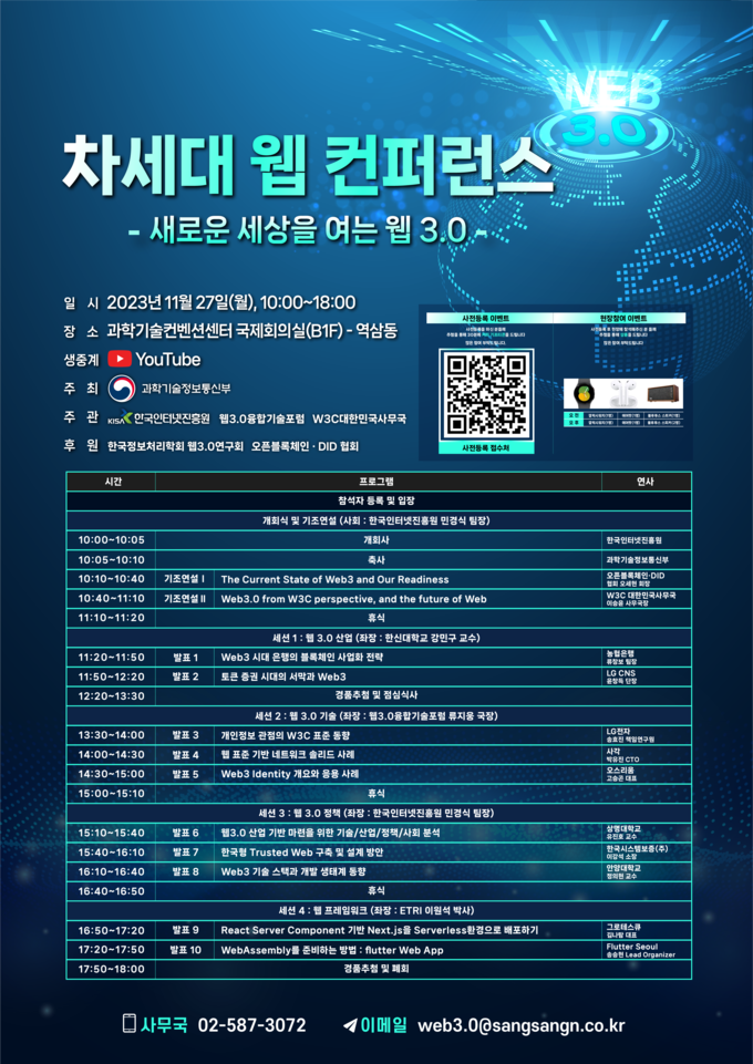 제1세션은 Web3 시대 은행의 블록체인 사업화 전략, 토큰증권 시대의 서막과 Web3 등 웹 3.0 시대의 산업이 발표된다. 제2세션은 개인정보 관점의 W3C 표준 동향, 웹 표준기반 네트워크 솔리드 사례, Web3 Identity 개요와 응용사례 등 웹 3.0 기술이 다뤄진다.