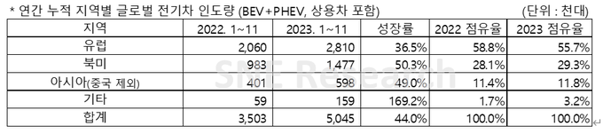 지역별로 살펴보면 유럽 시장은 폭스바겐, 스텔란티스 그룹의 판매 호조가 성장세의 주 요인으로 작용했다. 테슬라 또한 전년 동기 대비 판매량이 2배 이상 증가하며 유럽 시장의 점유율을 확대했다.