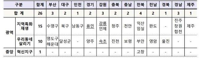 한편, 이번 신규 사업지 26곳 중 23곳(88%)이 비수도권이며 특히 지방 중․소도시(인구 50만 이하) 비중이 57.7%(읍면지역 42.3%)로 국토균형발전에도 기여할 것으로 보인다.