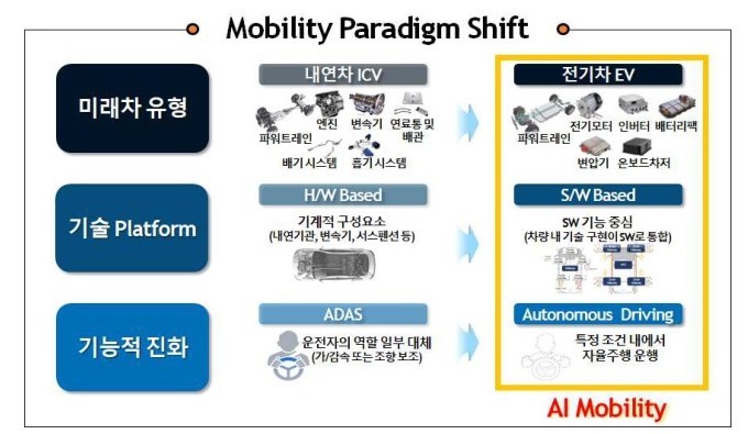 K-모빌리티 마더팩토리 구축을 통해 친환경차와 첨단 부품 생산을 강화하고, 전기차 기술개발 지원으로 2030년 주행거리 1,500km, 5분 충전, 내연차와 동등한 가격 수준 달성을 목표로 한다. 제조 과정 전반에 AI를 활용하고 미래차 AI 팩토리를 구축하며, 근로자와 첨단 로봇의 협업을 통한 ‘일터 혁신’도 추진한다.