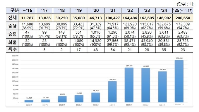기후에너지환경부(장관 김성환)는 2025년 11월 13일 기준 전기차 연간 보급대수가 20만 1천대를 기록했다고 밝혔다. 이는 종전 최고치였던 2022년 16만 4천대를 크게 웃도는 수준이다. 2011년 보급사업 개시 이후 2021년에 최초로 연 10만대를 달성한 뒤, 4년 만에 두 배 이상 증가한 셈이다.