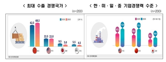 한국경제인협회(한경협)가 매출액 1,000대 기업 중 200개사를 대상으로 실시한 '한·미·일·중 경쟁력 현황 및 전망 조사' 결과를 17일 공개했다. 조사 결과 2025년 현재 수출 최대 경쟁국으로 62.5% 기업이 중국을 꼽았다. 이어 미국(22.5%), 일본(9.5%) 순이며, 2030년에는 중국 응답 비중이 68.5%로 상승하며 수출 경쟁이 한층 치열해질 것으로 나타났다.