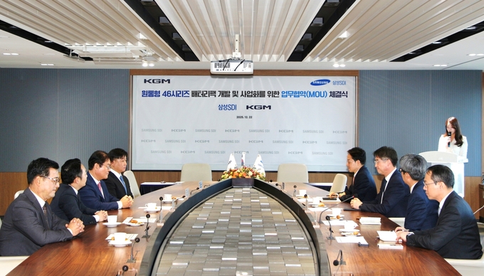 KG 모빌리티는 친환경차 미래 시장 대응을 위해 삼성SDI와 전기차 배터리팩 개발 및 사업화를 위한 전략적 업무협약(MOU)을 체결했다고 밝혔다. 협약식은 지난 22일 서울 중구 KG타워에서 열렸으며, KGM 곽정현 사업전략부문장과 삼성SDI 최익규 소형사업부장을 비롯한 양사 관계자들이 참석했다.