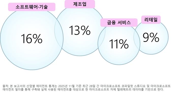 또한, 마이크로소프트는 2026년을 ‘AI 에이전트의 해’로 전망했다. 로우코드·노코드 도구 확산으로 지식 근로자가 직접 에이전트를 개발하는 환경이 마련되며 자동화 도입이 전 산업으로 확대되고 있다는 분석이다. 실제 활성 에이전트 비중은 유럽·중동·아프리카 42%, 미국 29%, 아시아 19%, 아메리카 10% 순으로 나타났으며, 산업별로는 소프트웨어·기술(16%), 제조(13%), 금융(11%), 리테일(9%) 순으로 도입이 활발했다.