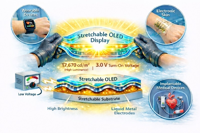 이를 적용한 신축성 OLED는 3.0V의 낮은 전압에서도 구동되며, 9.5V에서 최대 1만7,670cd/㎡의 고휘도를 기록했다. 이는 일반 스마트폰 디스플레이를 웃도는 수준이다. 전류 효율 역시 10.35cd/A로, 보고된 신축성 OLED 가운데 세계 최고 수준을 달성했다.